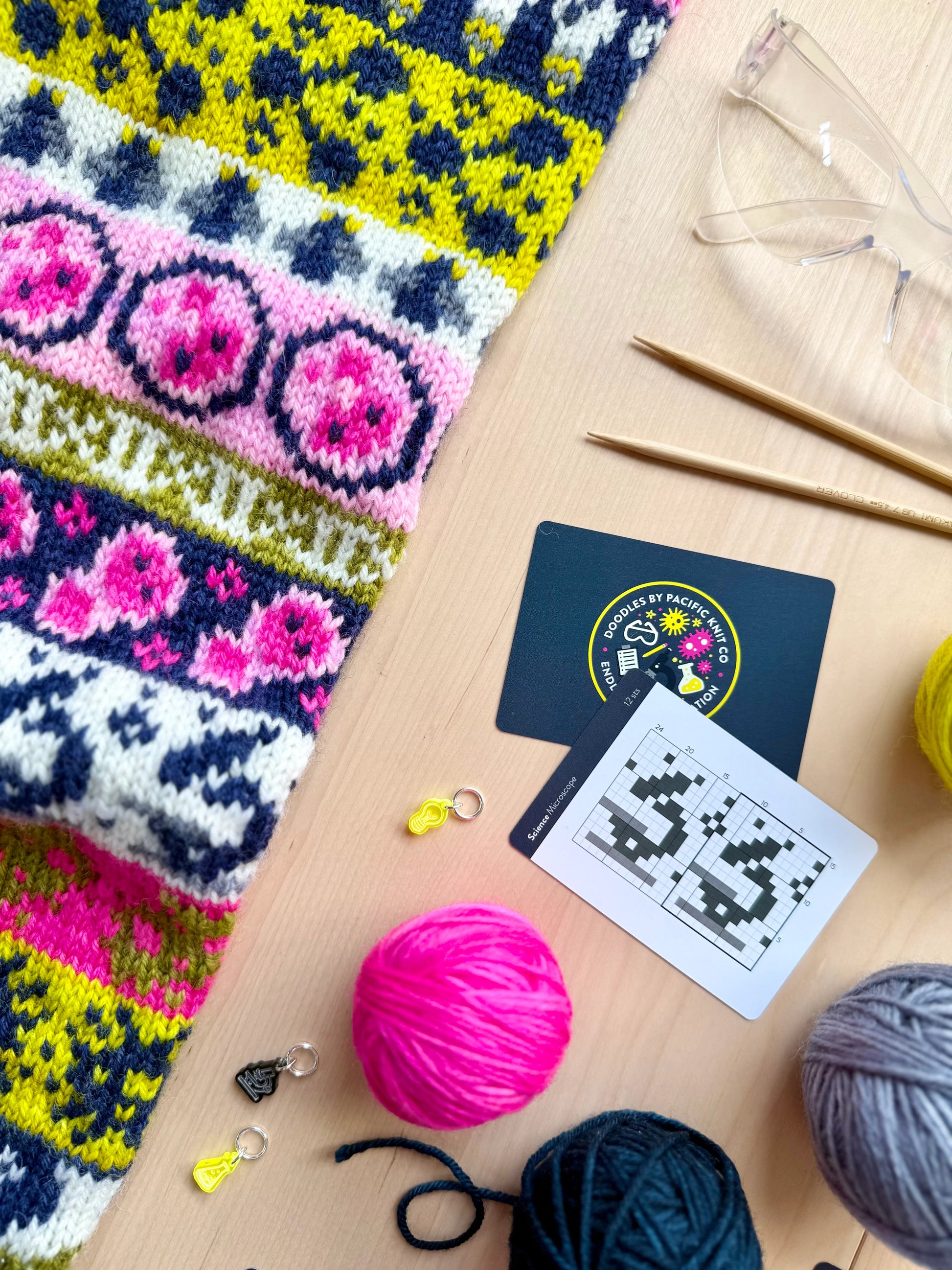 THE SCIENCE DOODLE is inspired by the tools of the core sciences of biology, chemistry, physics - from lab equipment to tiny microbes and DNA! Whether it's backyard science or advanced research, this collection has everything the nerdy knitter needs!